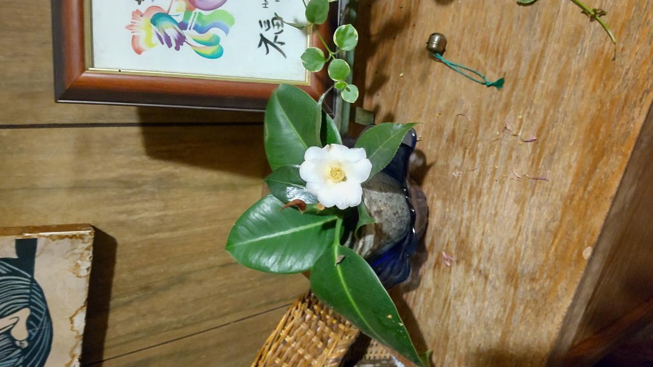 蕾の侘助を一輪とってゴムの枝と一緒に水に差しておいたところあっという間に花が開いた。「お茶席に持っていくのはひらく寸前の蕾です。この見極めが実にむつかしい。」豊美園の御大の言葉を思い出した。2025年も最終日になりました。水を吸って花開くのは植物だけではなく、裸虫と言われる人間も同じと思われます。もっと光を、もっと水を、という心境で新しい年を迎えたいものです。